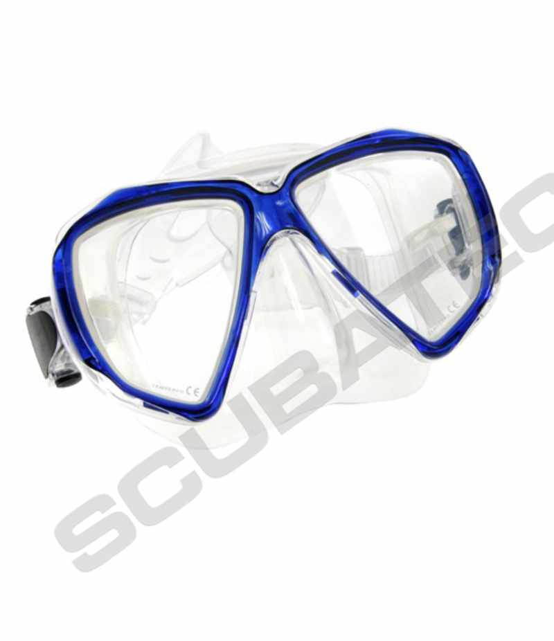 Maske mit geteilten Gläsern für ein klares Sichtfeld. Der Maskenkörper besteht aus transparentem Silikon, während die Glaseinfassung und der Rahmen in stilvollem Blau oder leuchtendem Pink erhältlich sind.