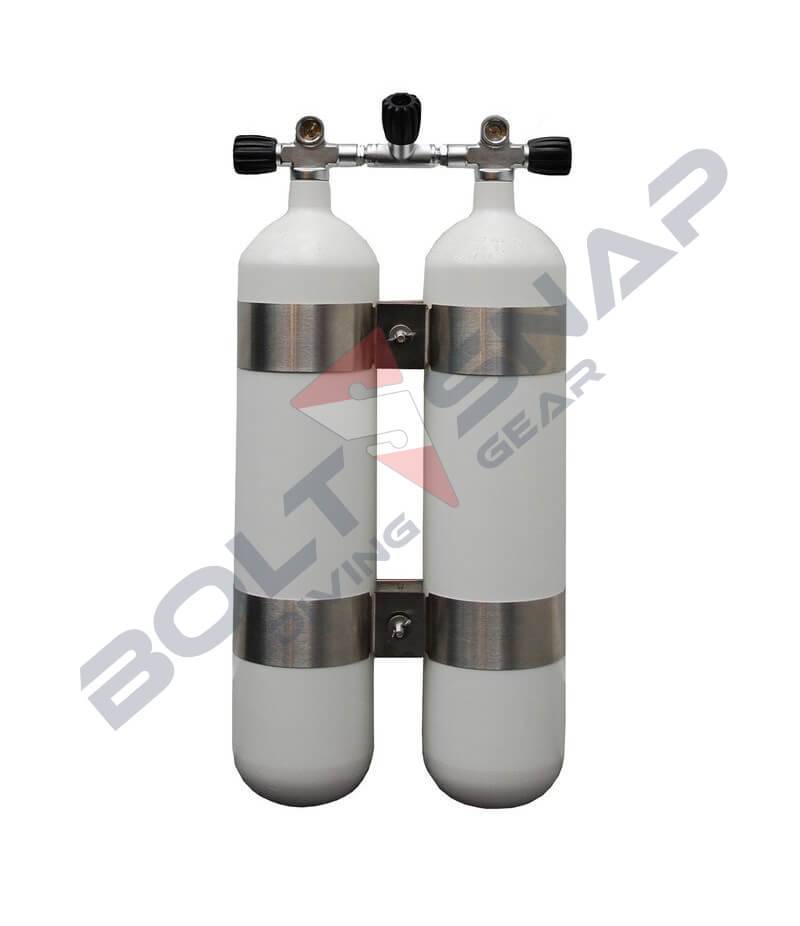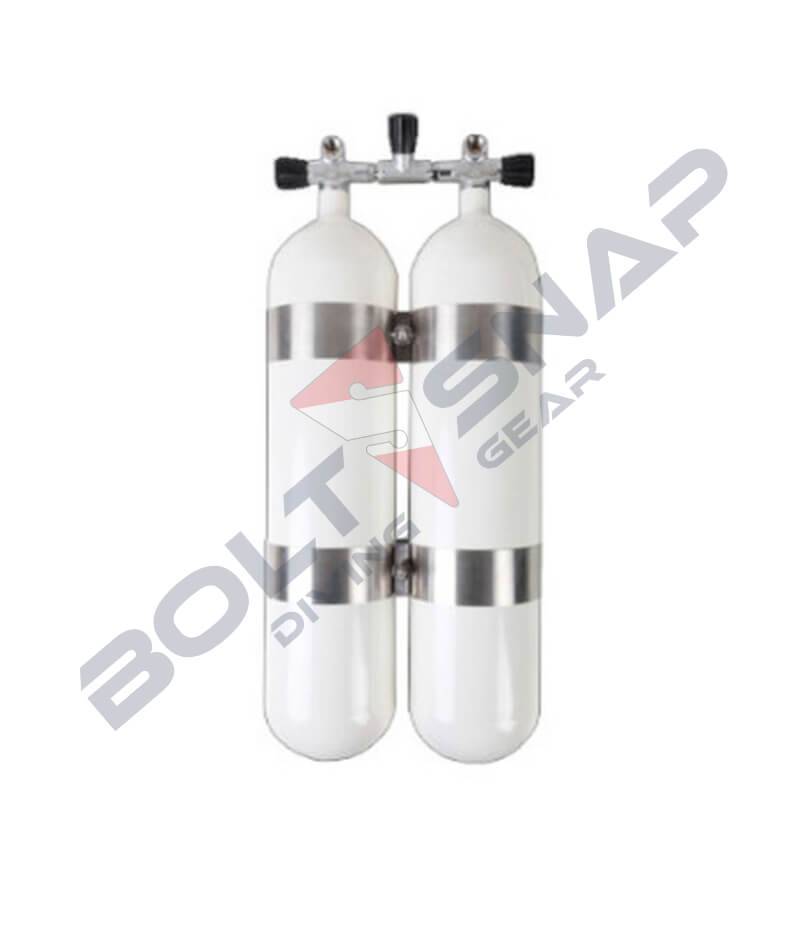 Doppeltauchgerät von Eurocylinder mit Absperrbrücke und V4TEC Schellen,verzinkt, grundiert und weiß lackiertmax Betriebsdruck 300 barFlaschenkörper: ca 2 x 9,0 kg, Durchmesser 140 mm, Länge ca 62 cm, Flaschenabstand ca 40 mm oder 14 mm