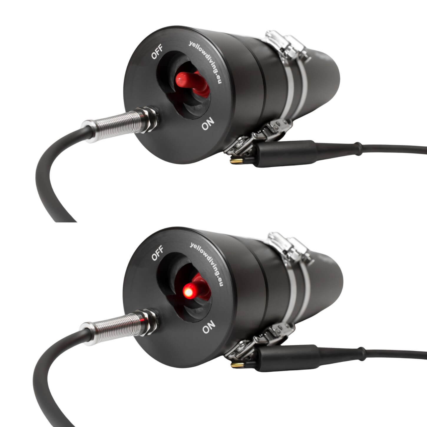 Alle Yellow Diving Akkus mit Standard Schalter haben eine LED, welche anzeigt, dass der Akku eingeschaltet ist. Dies ist sehr praktisch, da man unter Wasser sehen kann, ob die Schalter in ON oder OFF Position sind und ob Spannung anliegt.