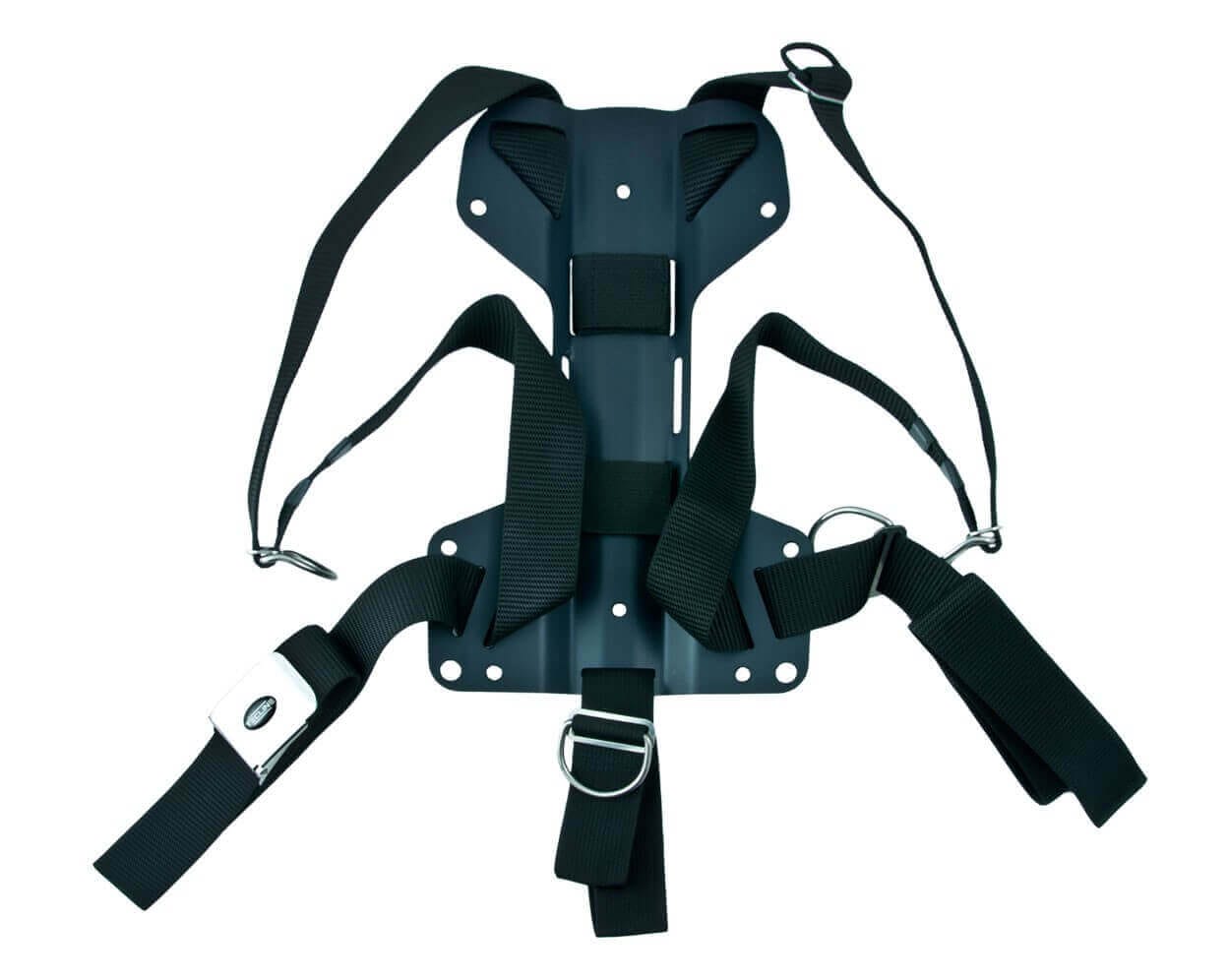 Standard DIR Harness mit verstellbaren D-RIngen + Mini-Backplate aus Edelstahl, in H-Form.